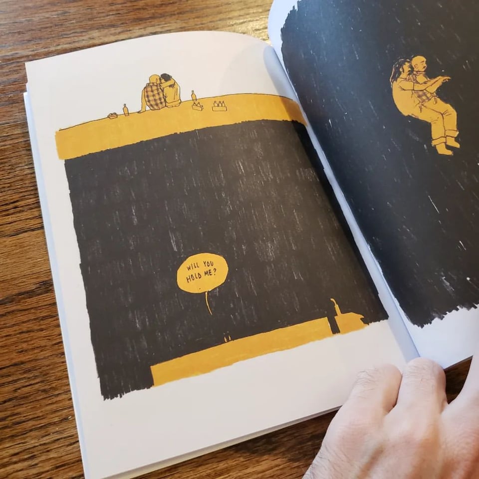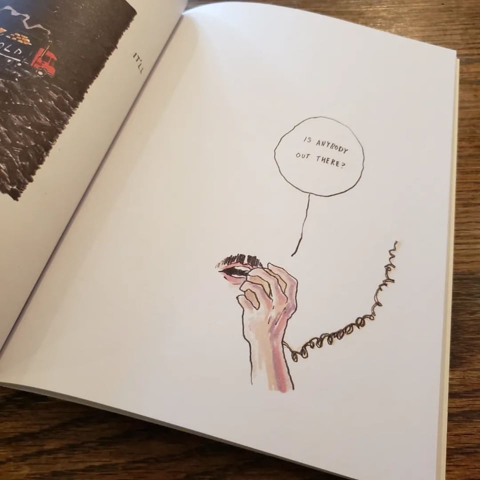 The story itself is also lovely. It follows a lonely trucker looking for intimacy on the open road, connecting with other drivers through the ghostly crackle of his CB radio and, briefly, through skin-to-skin contact. Degenstein lets the images and dialogue do most of the work; the brief wisps of narrative text that usually represent the trucker’s internal thoughts knit the book together but never try to convey too much. The way these words are arranged on the page, often in irregular, descending patterns, makes them feel like a parallel set of lines — poetic, rather than pencil-drawn.