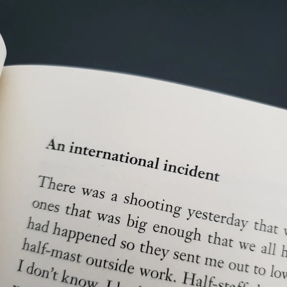 One story that I can’t get out of my head follows a man whose job is to lower a flag to half-mast outside his workplace every time there’s a mass shooting in the news. But the shootings come so relentlessly that he keeps lowering the flag, again and again, until he has to start digging a hole around the flag pole so the flag doesn’t touch the ground – and he keeps on digging and lowering until “the planet itself was spinning on this flag pole’s axis.”
