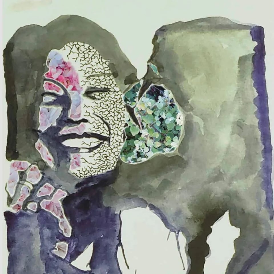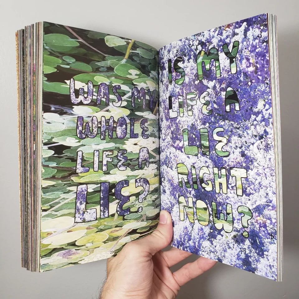 The resulting collage can be quite beautiful. Found documents and drawings are layered on top of background images that all seem to have deep significance, especially the copious flower patterns. The friend in question, Jodie, is linked with a pattern of white blossoms and green leaves, while MariNaomi’s figure on the page is often filled with red or pink flowers. It’s a striking visual conceit that, along with other such patterns (like the repeated appearance of purple lilacs), helps bind together what could’ve been, in less capable hands, a fragmentary or disjointed book.