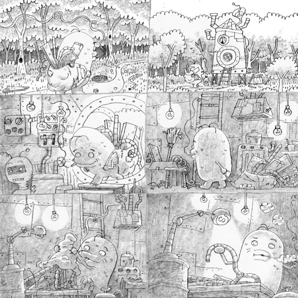 Jonathan is overcome with childlike joy and decides to tinker with his little robot helpers (who've been building his house for him) and transforms some of them into little musicians. After that, well, without spoiling the ending, I'll just say that the old bots and new bots do NOT get along, an conflict that threatens Jonathan's cozy little forest setup.