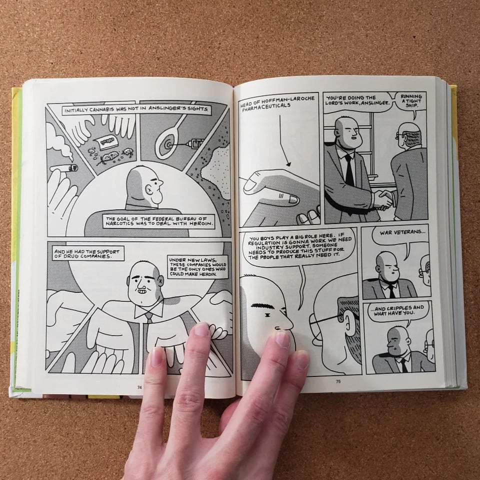 Cannabis explores in great detail how specific lies and myths about marijuana were spread by powerful people – whether motivated by a desire to advance their own political careers or just straight-up racism. Brown’s stripped down style is also really great for this kind of historical explainer. But the book also has a few moments of complex, beautiful page designs.