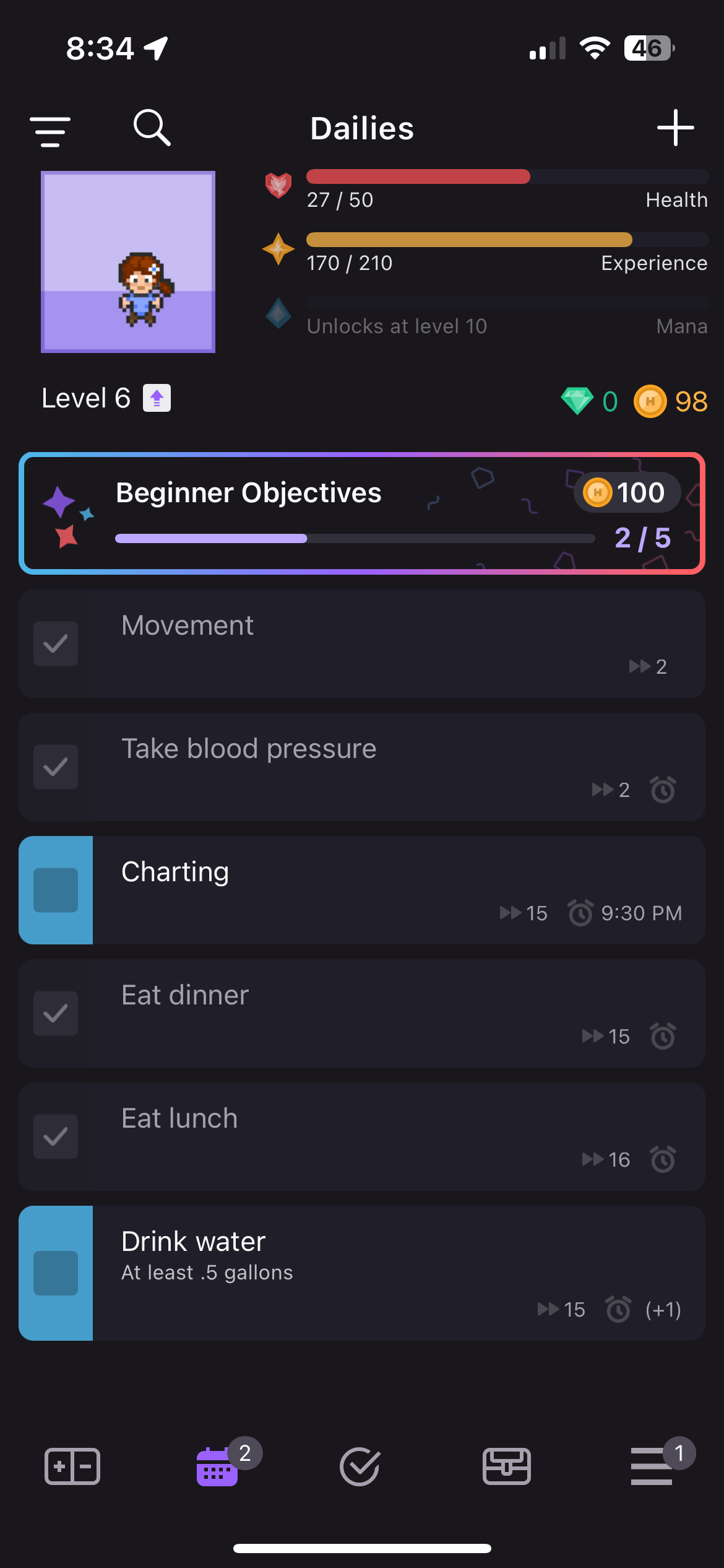 The thing I love most about this app is that missing a day, or not doing it perfectly, doesn’t immediately break your streak or kill your Tamagotchi/Mario Brother. It just makes you a little weaker each time, and you can always strengthen as you re-commit to your habits. I have a tendency to quit when the streak ends; however, Habitica naturally encourages resiliency.