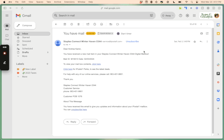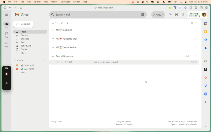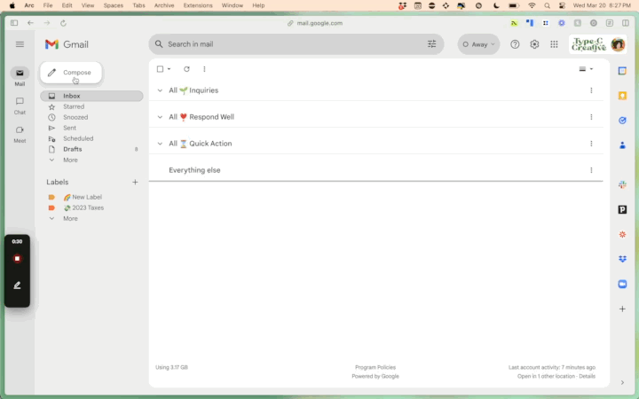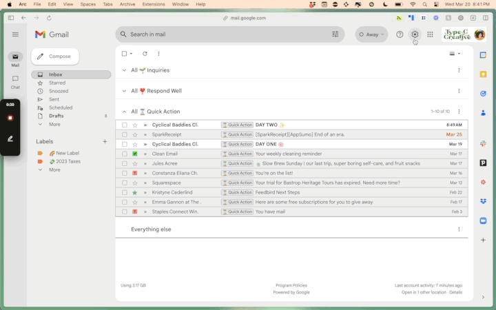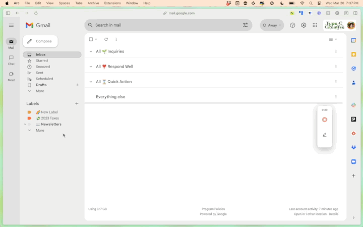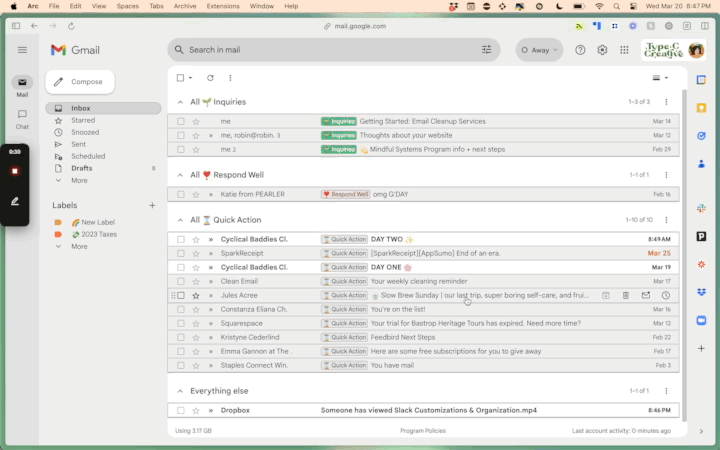Sometimes seeing all those different colors and emojis can be overstimulating. I like to keep most labels as ‘Show if unread’ so they only pop up if there’s a new email in the filter. I also like to mark things as ‘Show’ if there’s a particular project or client I want to keep top of mind. Right now, that’s 2023 Taxes 🙃