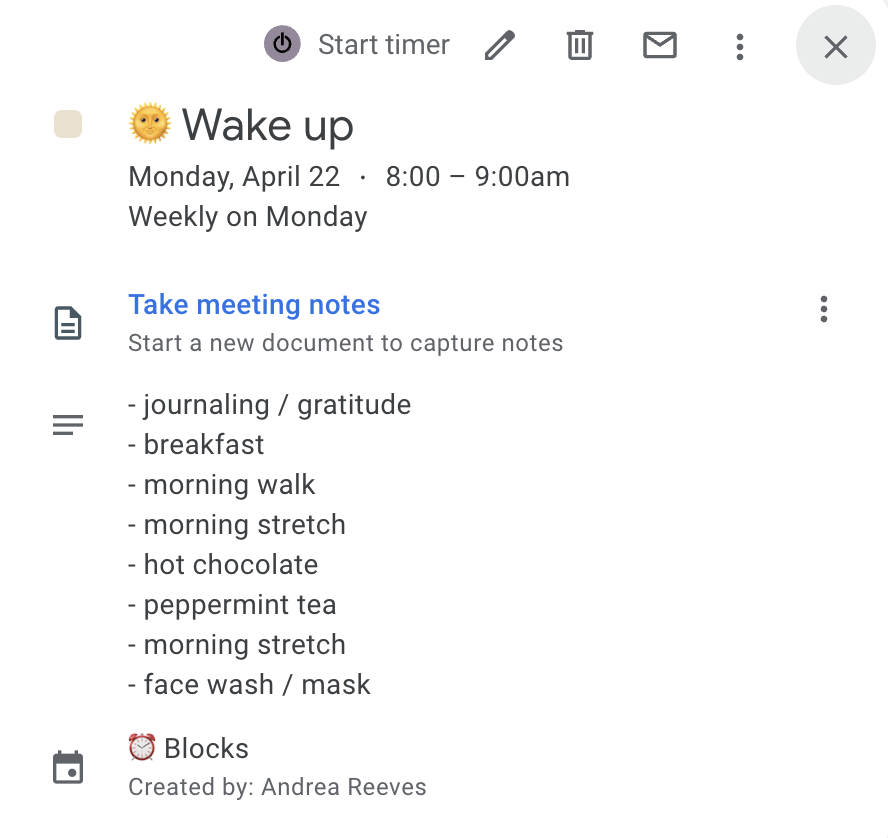 I like to include a list of things I may want to do in the mornings and evenings to the descriptions of the recurring Wake-Up and Wind Down blocks in my calendar. I don’t always pay attention to the recommendations but I like to have the option! (I just noticed I have “morning stretch” on there twice…DOUBLE RECOMMEND!)