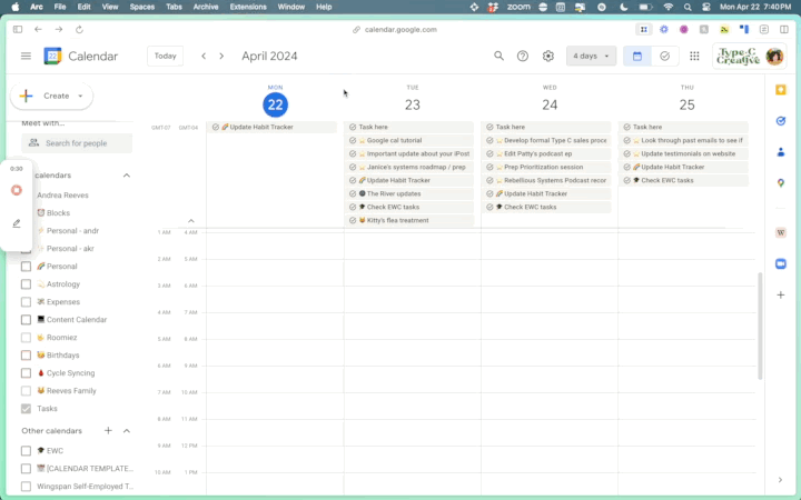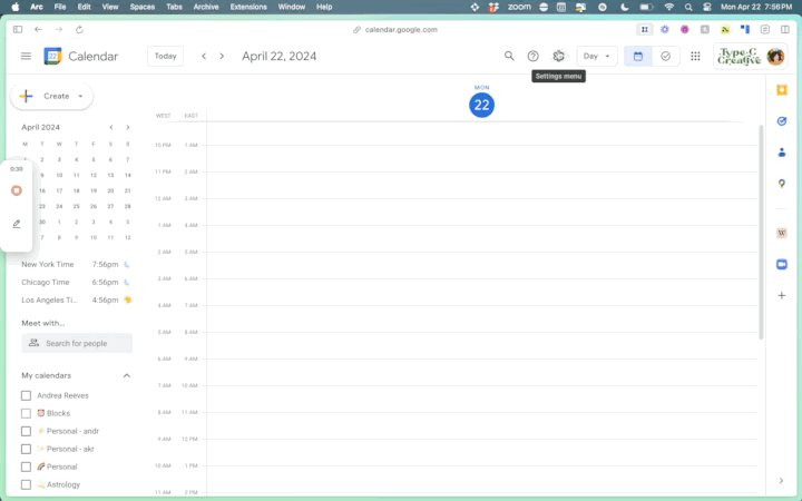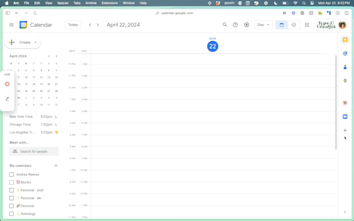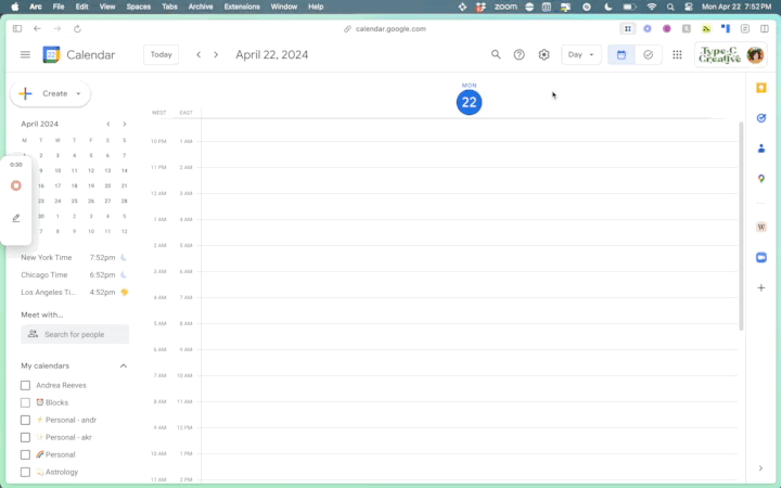 Many Type C clients are located on the West Coast, which made scheduling things a bit of a nightmare for my brain. That’s why I added a secondary timezone to the side of my calendar. So when a client on the West Coast says “10 am my time,” I can easily add an event to the calendar without thinking about it.