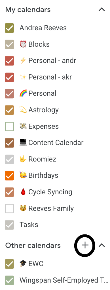 ❣️ Don’t forget: If you use a scheduling software like Calendly or Acuity, you’ll want to add these additional calendars if you’d like the system to reference them for availability purposes.