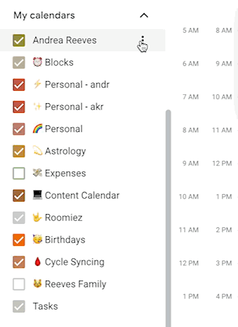 I’m a highly visual person, so it’s important for me to distinguish different types of events and holds using different colors. For example, I have one color for personal events, one for work meetings, and one for holds and time blocks/buffers. To do this, I have to create separate calendars based on the type of event.