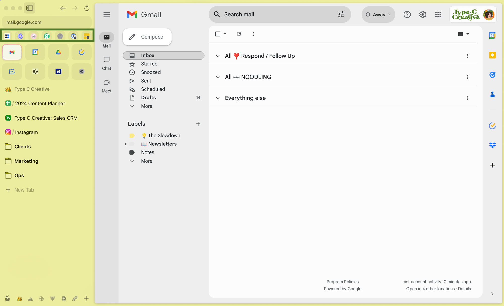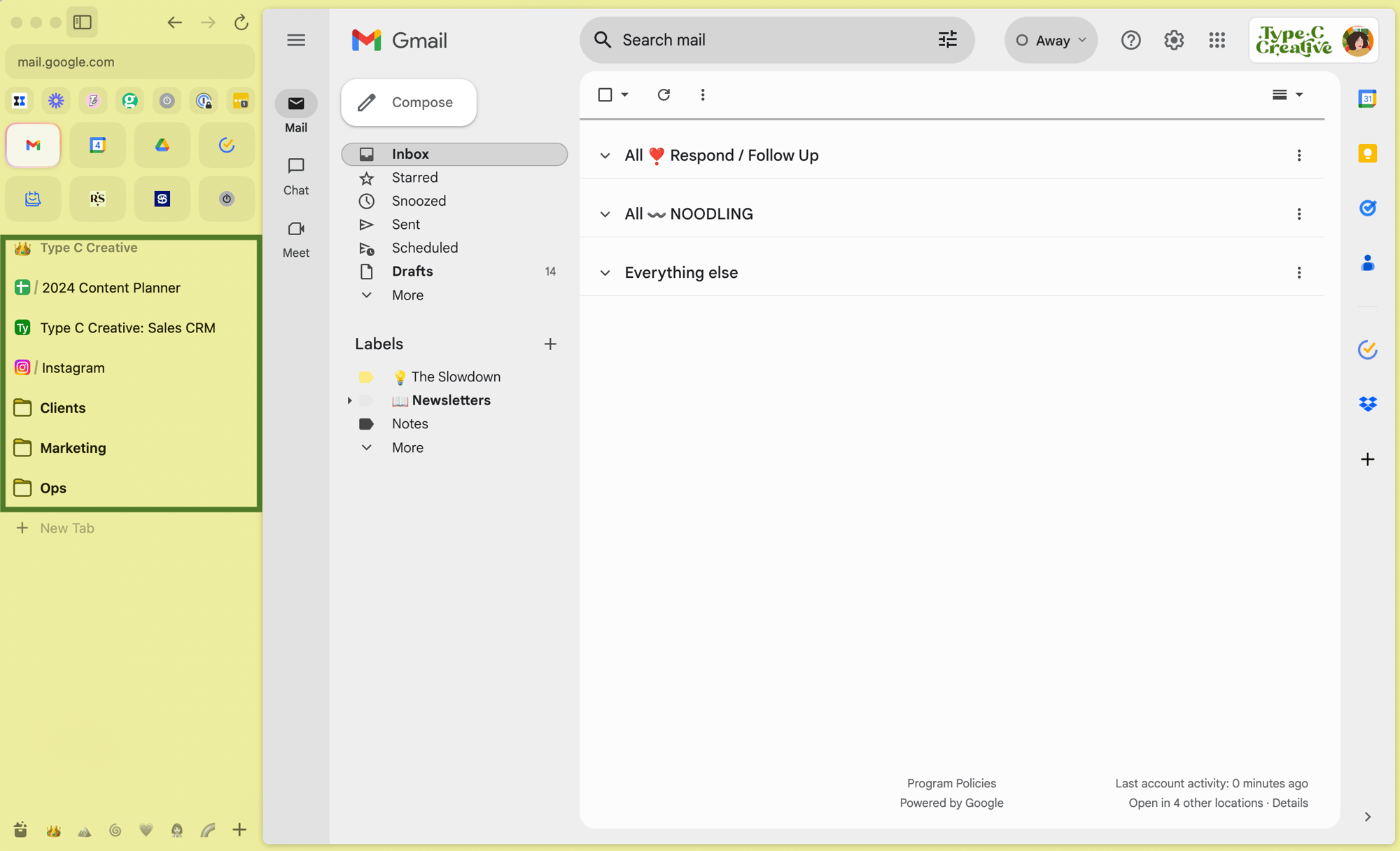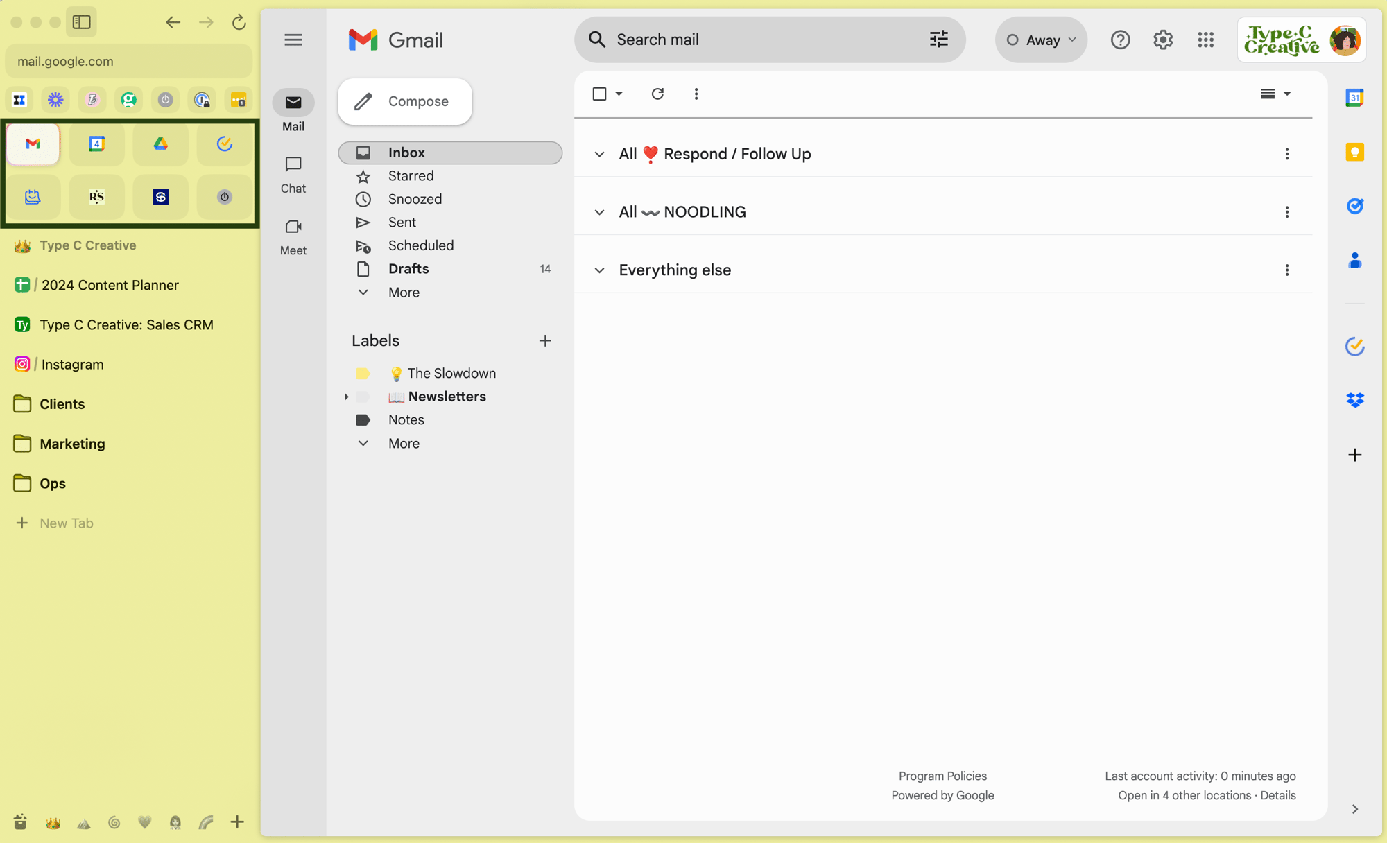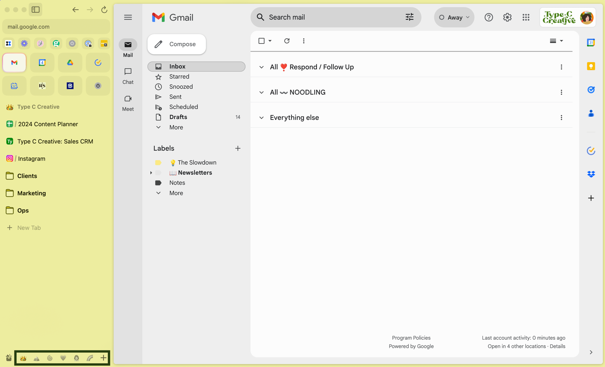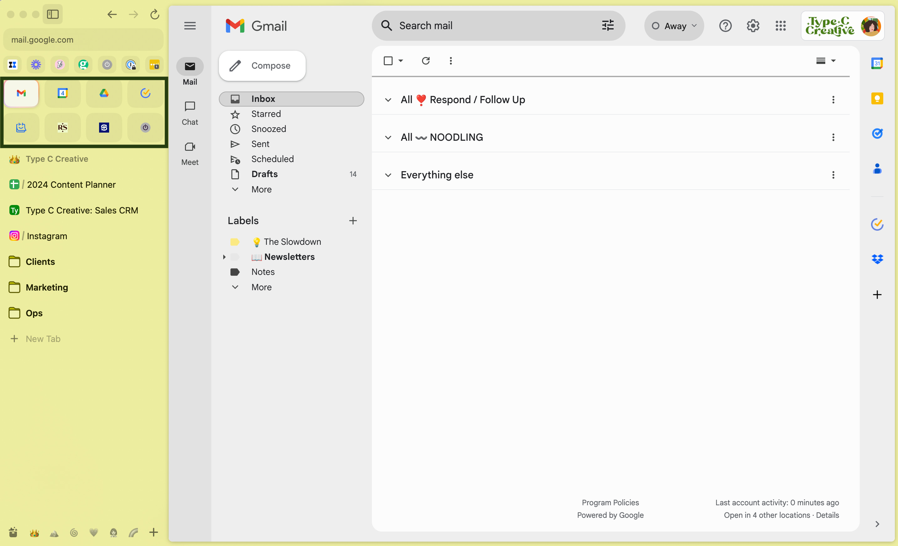 In each Space, I have my pinned tabs. These are like bookmarks. I pin my most-used pages within each Space; because they’re organized by client, each bookmark list is short, making it easy to find the things I need.