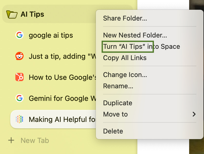 Arc auto-groups tabs based on subject matter with their “Tidy” feature. You can also turn these into folders to pin for later.