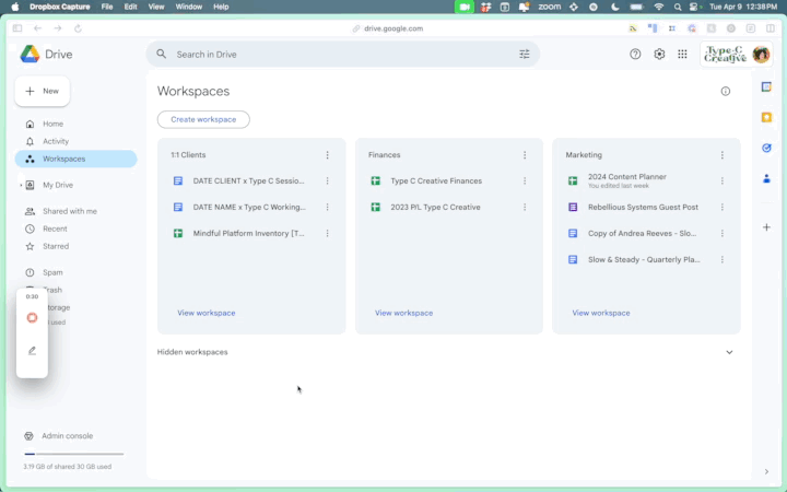 If you have a Google Workspace account (if your Gmail address has a custom domain like hello@typec-creative.com, you probably have one), Google Workspaces is an incredible way to keep things organized and easily accessible in your Google Drive.