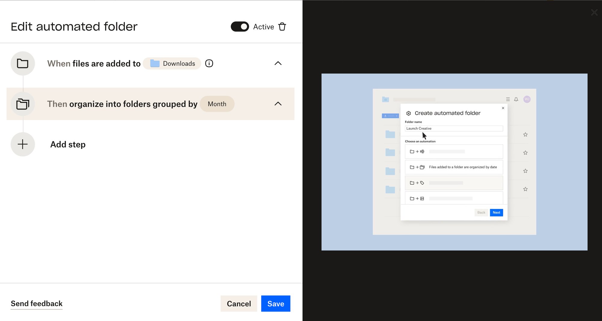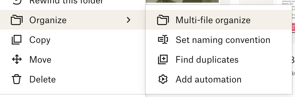 Go to the folder you’d like to automate, hit that little gear again, and go to Organize > Add automation.