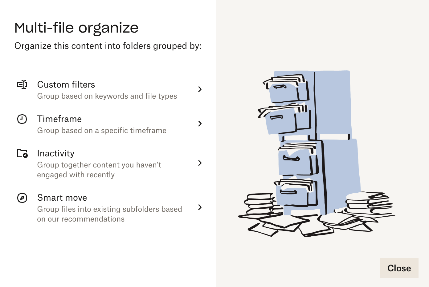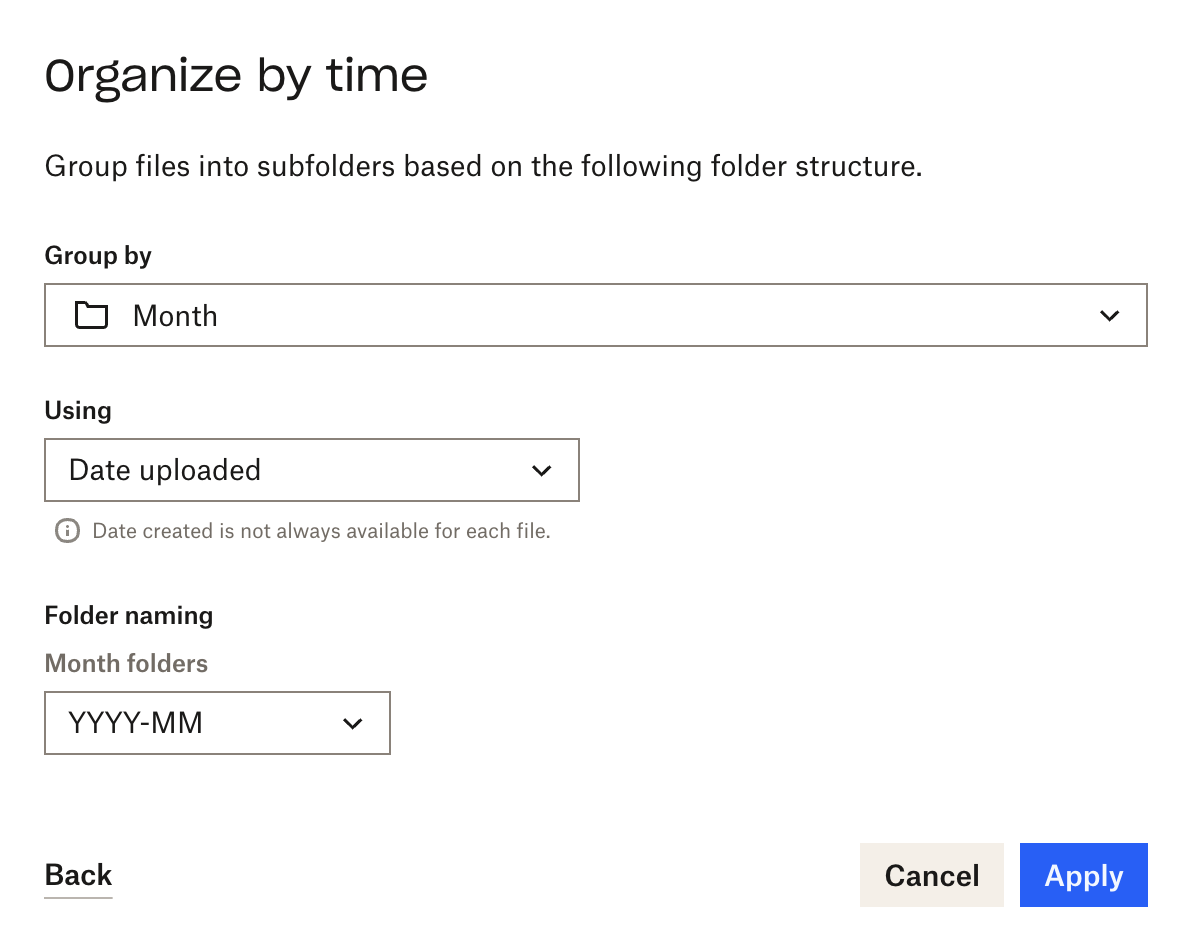Select how you’d like Dropbox to organize your files. For photos and downloads, I stick to the Timeframe option.