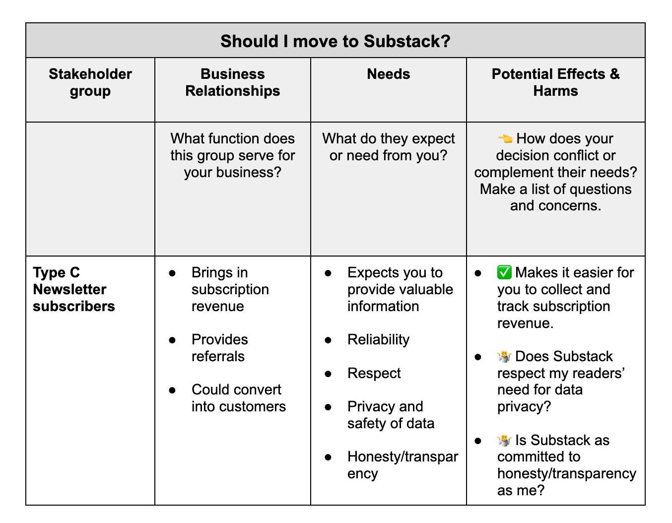 So when working through Andrea’s decision to move to Substack, the stakeholders would be Type C Creative and you, newsletter readers! We’ll use the latter as an example.