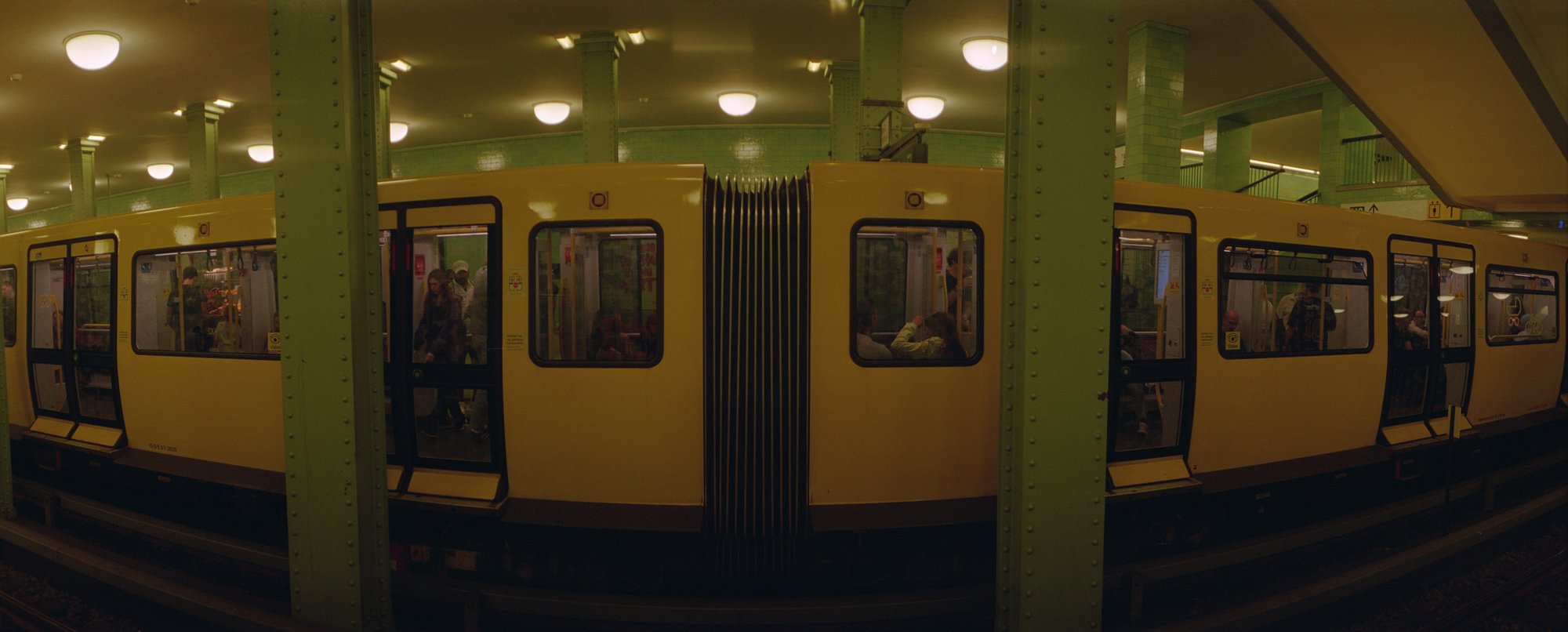 I spent an entire evening running around the city taking panoramas furiously with a dead phone, in a city I’d never been to, where I didn’t speak the language. A lot of photos didn’t go my way. I was learning the mechanics of the swing-lens (which loves to accidentally include fingers inside the frame), and finding an eye for composing with something so wide. Despite my unfamiliarity, I got a few really interesting shots. A mirrored self-portrait in yellow, and a lonely view from a bridge of a highway and the ringbahn.