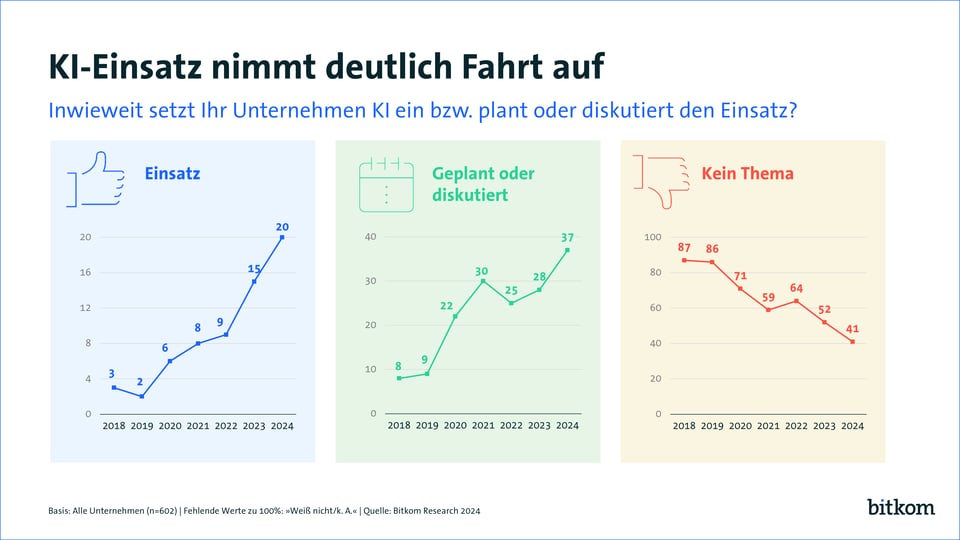 Und jetzt mal noch zu den guten Nachrichten: Erstmals beschäftigt sich mehr als die Hälfte der deutschen Unternehmen mit KI. Auch wenn der Anteil der Nutzer mit 20 Prozent noch ausbaufähig ist, die Kurven sind steil und zeigen in die richtige Richtung. Hier geht es zu den gesamten Ergebnissen der Bitkom-Studie.