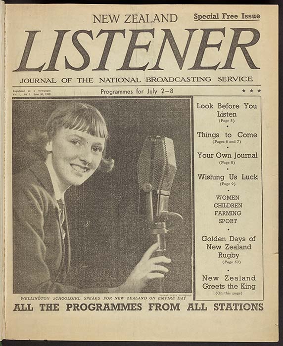 The first edition of the Listener was published on 30 June 1939 under the editorship of Oliver Duff and posted free to every household. Established under the mantle of the National Broadcasting Service, the Listener was for its first half century a state-owned publication. Prime Minister Michael Joseph Savage wrote that it would serve as ‘a useful guide to radio listeners, and should promote still further the popularity of broadcasting’. Already, he noted, 84 per cent of households had licensed radio sets and these were fast becoming ‘an essential means of acquiring entertainment and instructive information’.