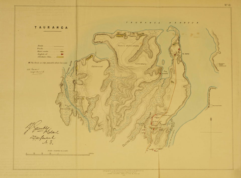 British officers did not know quite what to make of this document (which Mikaere and Simons suggest could be traced back to arguments advanced during the first Taranaki War of 1860-61) and ignored it altogether. But on 16 April 1864, Tauranga Māori began constructing a new fortification on a ridge about five kilometres inland from the Te Papa station where the missionary estate ended and Māori land began. The troops called it ‘the gate pā’ because of a gate that ran along the boundary. Māori knew the ridge as Pukehinahina.