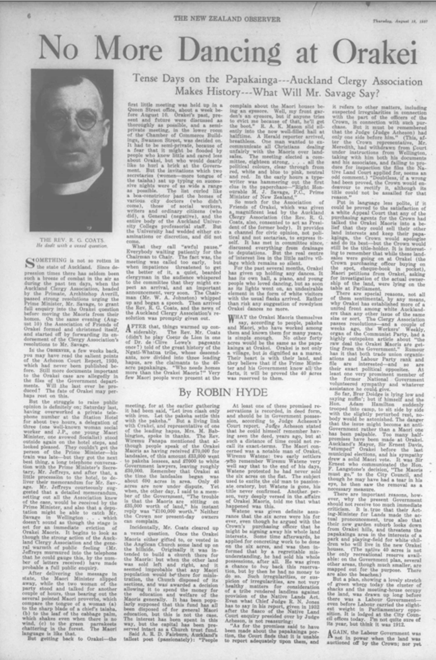 Something is not so rotten in the state of Auckland. Since depression times there has seldom been such a breeze of combat in the air as during the past ten days, when the Auckland Clergy Association, headed by the Primate, Archbishop Averill, passed strong resolutions urging the Prime Minister, Mr. Savage, to grant full enquiry into the Orakei question before moving the Maoris from their homes. On the same evening (August 10) the Association of Friends of Orakei formed and christened itself, and started off by forwarding its endorsement of the Clergy Association’s resolutions to Mr. Savage.