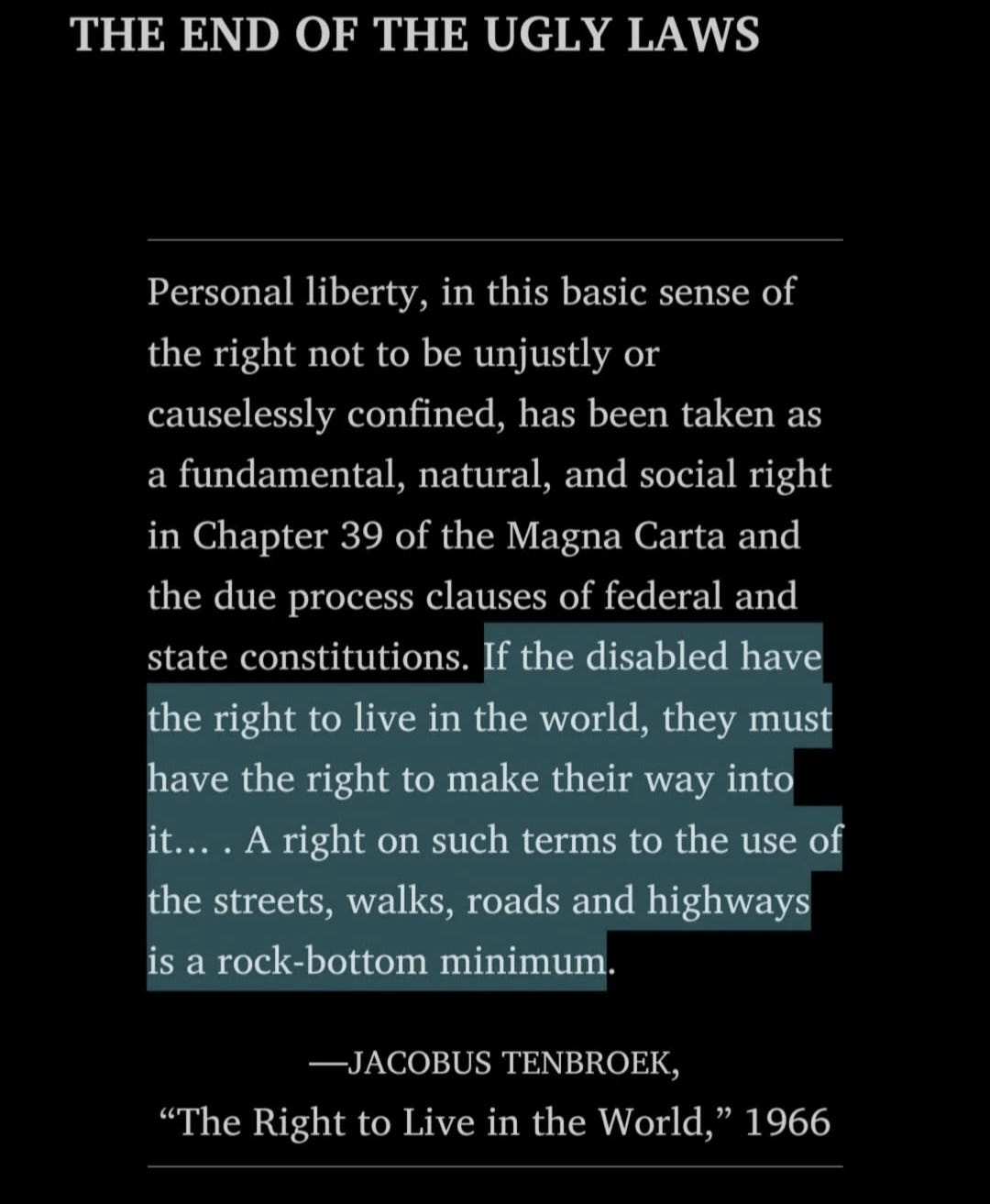 Last July, I posted this quote on Instagram after I finished reading The Ugly Laws: Disabled in Public by Susan M. Schweik (I highly recommend this book). In the caption, I wrote: "Extremely heartbreaking to read this quote while politicians & others in power are trying to deny immunocompromised, chronically ill, & other disabled people "the right to live in the world" through mask bans, lack of COVID precautions anywhere including hospitals, etc."
