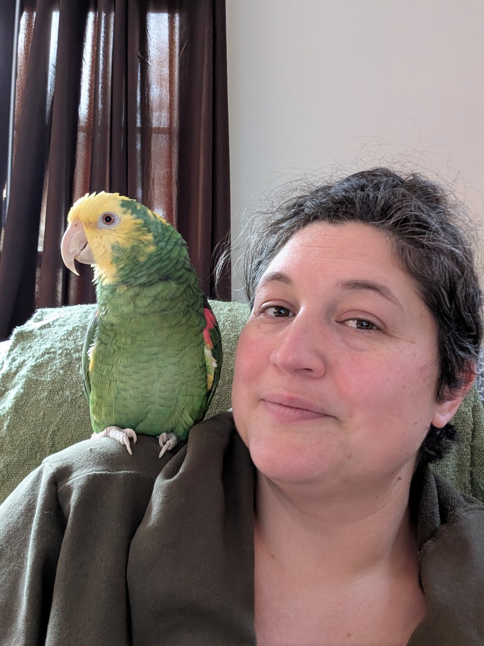 Other than holidays…we did end up taking in Milo, the Amazon parrot I mentioned in my last update. He is a she, as we were informed by Dr. Holmes, who’d been her vet with her previous owners and was overjoyed to hear that she was going somewhere that she’d be able to stay her veterinarian. She said she’s “terribly fond of this bird”, which was funny when Milo decided to bite her at her checkup on the 29th. Dr. Holmes, being an avian vet of many years, barely flinched. We spent $1000 (yes, you read that right- add cost to your list of why I caution folks against having birds as pets without serious consideration and planning!) on a number of tests, as she has a history of infection, heart troubles, and so on. We’ll see what they say, and we’ll keep working on her diet to see if we can get her healthier (she was very clearly fed junk with her previous owners, and will try to beg food off of your plate, and throw tantrums if she sees potato chips or fries…). She’s been very sweet overall, and Dr. Holmes actually said she’s hormonal right now (her ovary was QUITE large on x-ray), so she’s apparently even sweeter normally, being described as a cuddlebug. I don’t know how that could be possible, but we’ll see! She’s 21, so if we can get and keep her healthy, she’ll be here for…the rest of our natural lives.