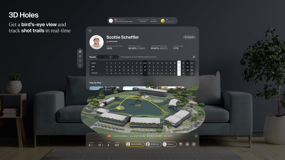 A step beyond decorative 3D is fully interactive volumetric elements. These, so far, seem to be a feature of the Sports category almost exclusively, but using data to provide additional insights and views of the action is a great example of what the device can do well. The NBA and PGA Golf seem to be leading the way in this category.