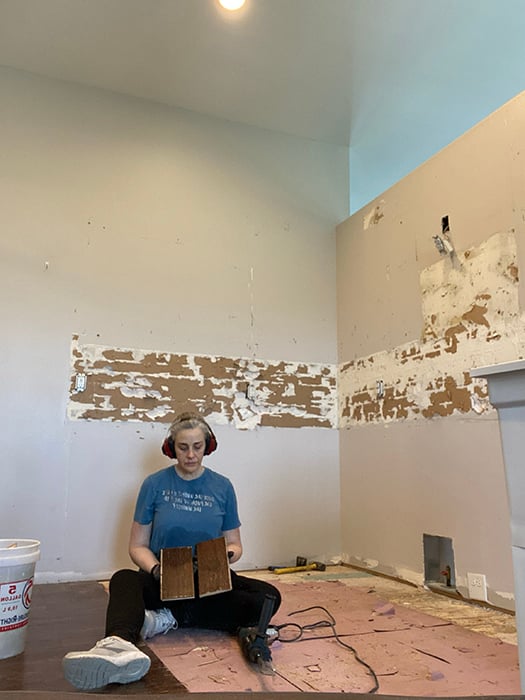 When my sister arrived late Friday afternoon, I was prying off baseboards. This tool (not an affiliate link) + a mallet was super dreamy for this job. I labeled all the baseboards and we stacked them in the garage.