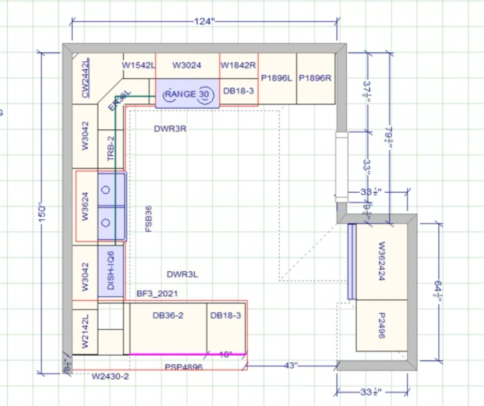Here’s where we landed. The 79” (plus a fraction I can’t make out because I don’t know where my glasses are) wall in the upper right w/ the door in it is the wall between the kitchen and laundry room that is (currently! as in today!) getting moved. As such, I won’t know if the back wall is really 124” until it’s finished because houses are never square. As soon as I have that number confirmed, cabinet boxes will be ordered.