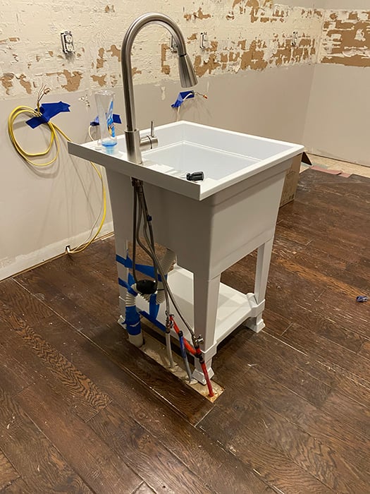 Last thing we did before collapsing in bed was hook up a temporary utility sink. We hurt all over and there appeared to be some missing parts. We made it work with painters tape 😂