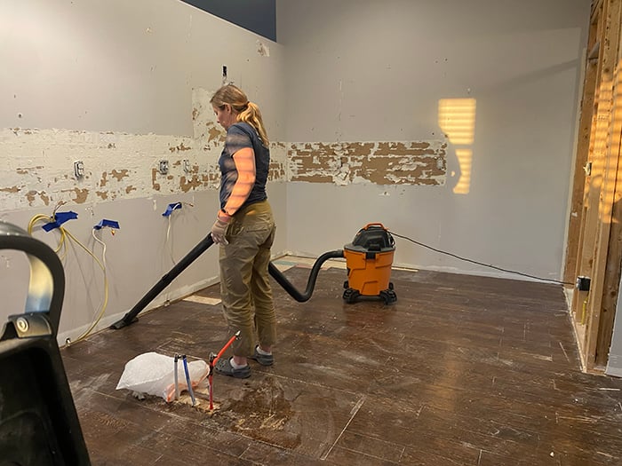 My sister left Sunday morning so I got to work on tearing out the damaged engineered wood flooring. I used an air hammer with a chisel bit and they came up pretty easy once I got the hang of it. I used a circular saw to cut a line between the kitchen/dining area and the front room where the flooring will be torn out in phase two. The circular saw is TERRIFYING, but thank you Eric for teaching me how to change blades, wear PPE, set depth, and use it without losing a digit or limb.