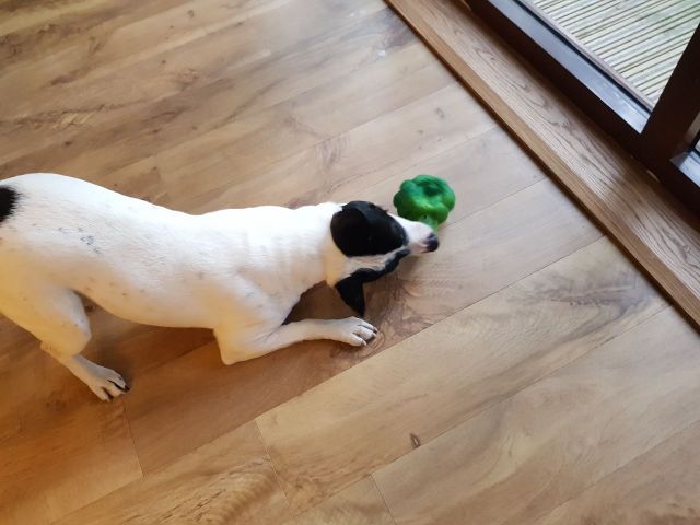 My friend bought Sky this plastic broccoli toy and she's more obsessed with it than anything else she's been offered so far. You just have to say the word "broccoli" and she goes hunting for it. I used to be very anti dogs-in-clothes, but had to admit coats are useful for short hairs pups in winter. It stops her shivering outside, but inside she happily gets bundled up in blankets and duvets (she nows regularly runs up to bed to curl up without prompting).