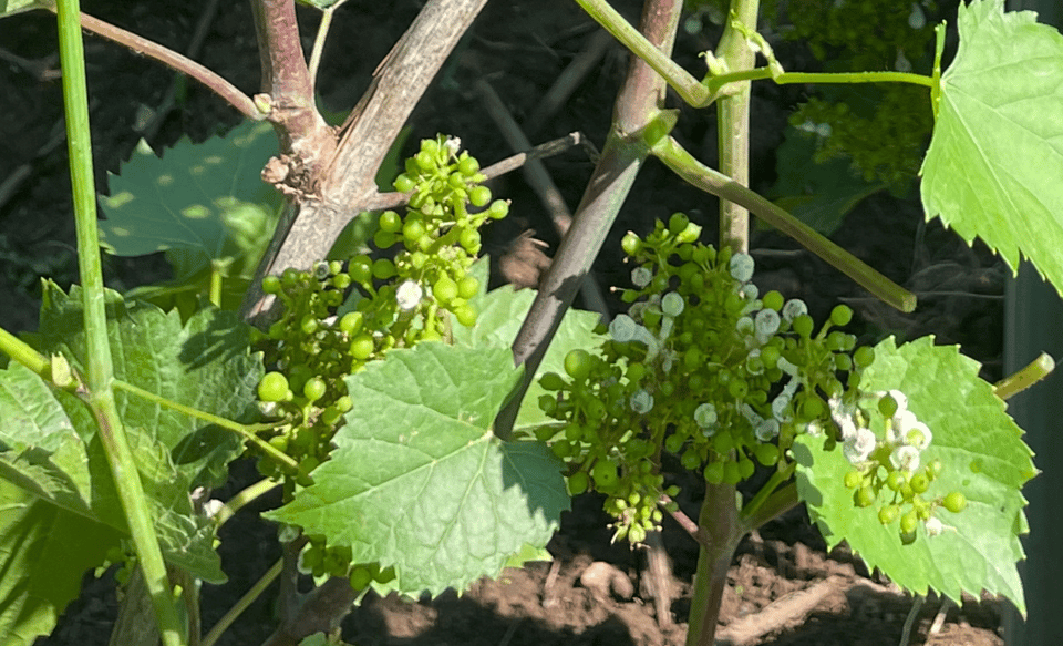 Des petites nouvelles de mi-saison de votre chroniqueur en vin ! Après les millésimes 2022, 2023 et 2024 très pluvieux et humides, voilà que 2025 en remet une couche. Sur les mois d’avril, mai, juin et si la tendance se maintient, juillet, on a reçu entre 50 à 100 % de plus de précipitation que la moyenne, sur chacun de ces mois. Ce que ça implique ? Très forte pression de maladie qui affecte directement soit les rendements ou bien la maturité du raisin (moins de feuilles en santé = moins de photosynthèse). En régie bio, il n’y a pas de solution magique : on traite souvent, dès qu’il est tombé 20mm depuis la dernière pulvérisation ou bien que le dernier traitement remonte à 7 jours. Cela dit, c’est très compliqué de pulvériser dans les jours qui suivent une pluie torrentielle puisque les sols gorgés d’eau nous empêchent de rentrer en tracteur. On attend et on fait une petite prière. Les traitements n’étant pas miraculeux, on effeuille la zone fruitière plus tôt qu’à l’habitude afin d’aérer cette zone névralgique. L’enjeu c’est qu’on doit le faire alors qu’on aurait normalement priorisé d’autres tâches. Je vous ai trouvé une belle petite photo évocatrice de ce que le mildiou fait lorsqu’il s’attaque aux grappes à la sortie de la floraison. Les baies recouvertes de mousse blanche ne se développeront jamais en raisin et risquent de contaminer le reste de la grappe avec une prochaine pluie ou même la rosée du matin.