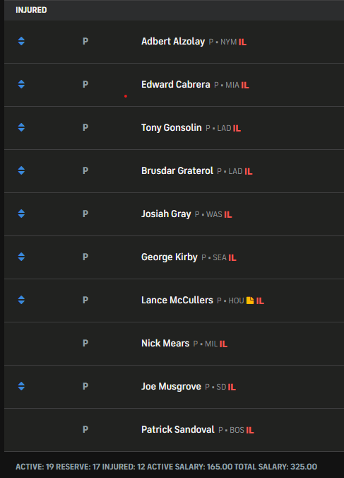 This season everyone but one RP was supposed to be healthy. Well…. We are half-way through the first scoring period. My team has the 2nd most point scored so far and likely will go 7-1 or 8-0 for the period. And yet, there are 14 players on IR already, including these pitchers: