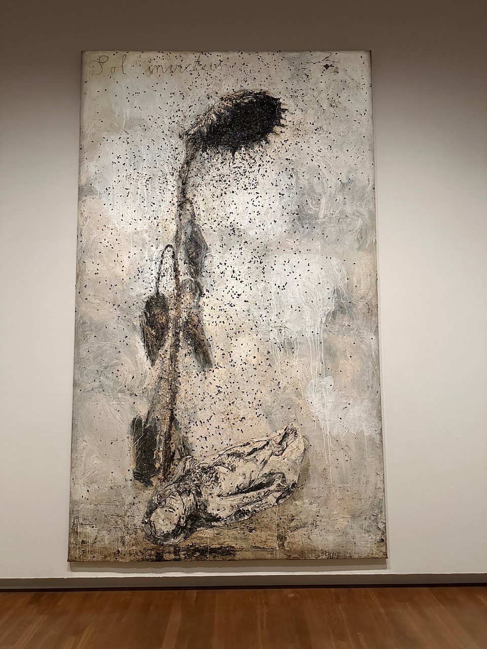 The first room contained a series of massive recent-ish works of his, enormous landscapes, Van Gogh-inspired fields, a cataclysmic take on Starry Night. I spent longer than I thought I would just getting close to some of them, taking in the layers of paint, plants, wood, and everything else he incorporated into his canvases. I studied the brittleness of the surfaces, the way they cracked like bark.
