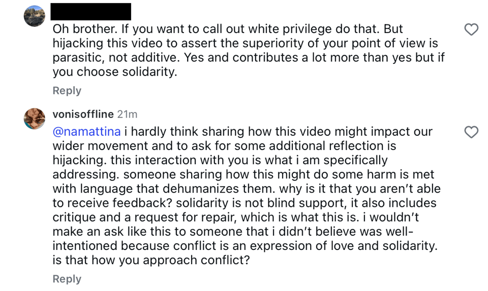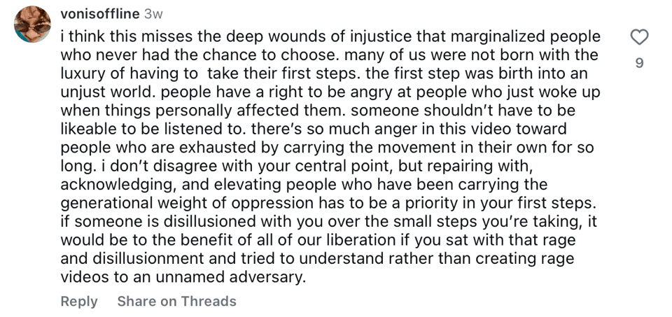 i scrolled the comments for awhile and saw that the OP only replied to the white people agreeing with them, and none of the BIPOC people calling them in, no matter how gentle the call-in was. that tells me a lot about the intent of the central message. this person is not actually interested in advancing our movement. those of us who have been in this work for decades can clock that pretty quickly. it was also telling to me how many white people in the comments were thanking OP for absolving them of their guilt. “i can’t protest because of XYZ reason, i don’t care that calling my rep doesn’t matter, i have to do something.”