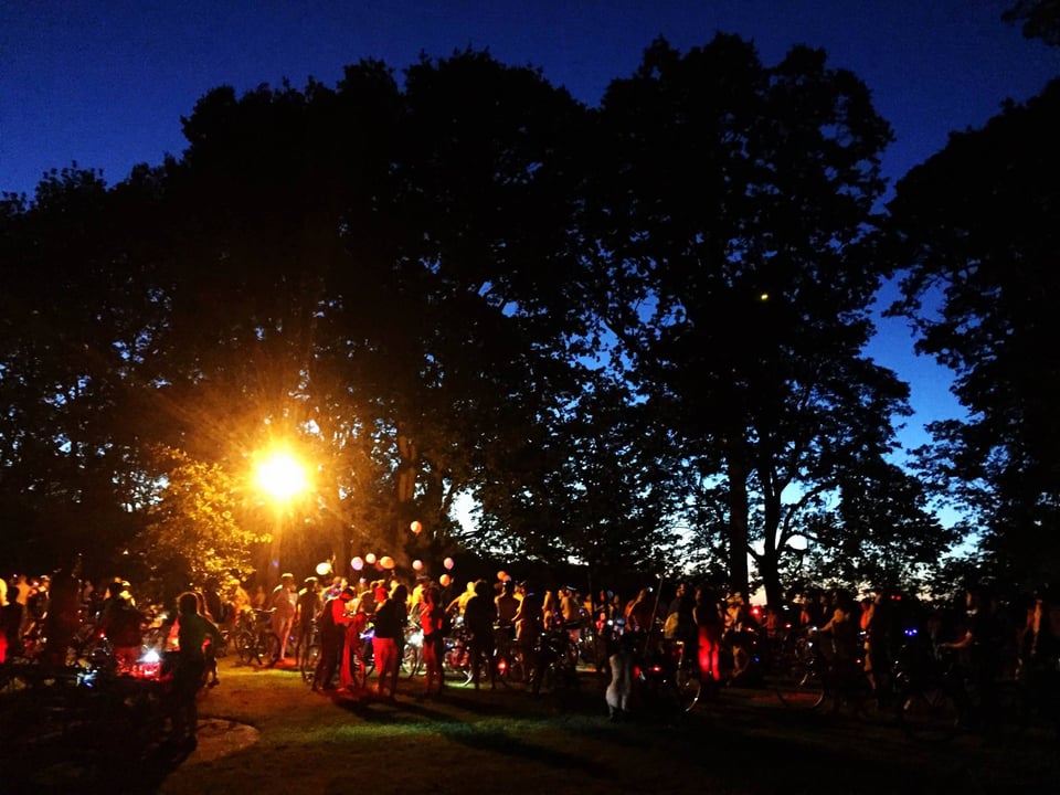 The procession arrives at Sellwood Park around 10 p.m., signaling the end of the ride. I lean my bike against a tree, take off my helmet, and decide against dressing. I’ve gone this long without clothes, so what’s another few minutes?
