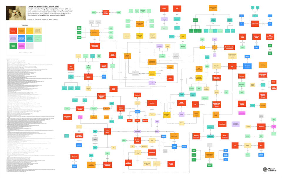 ICYMI: For the past eight years, the Music Tech Ownership Ouroboros has mapped the intricate web of financial investments and ownership stakes in music tech, with a focus on the growing influence of major labels, media conglomerates, big-tech companies, private equity firms, venture capital firms, and sovereign wealth funds.