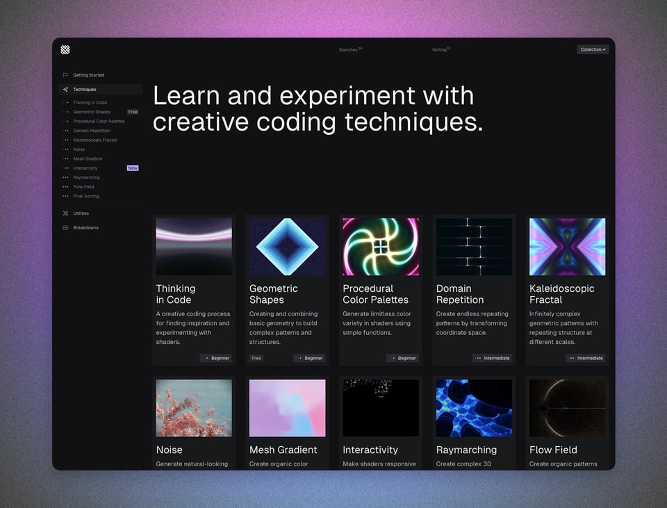 Check out Fragments.supply by Phobon — a course focused on beautifully animated shaders. With 27 lessons and 128 templates, it's a goldmine if you want to level up your creative coding skills.