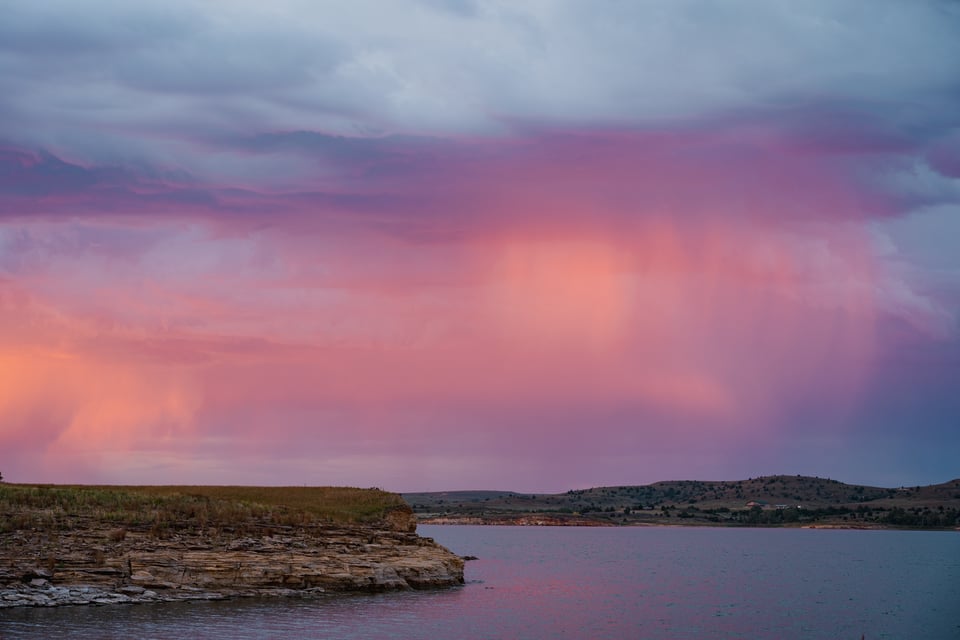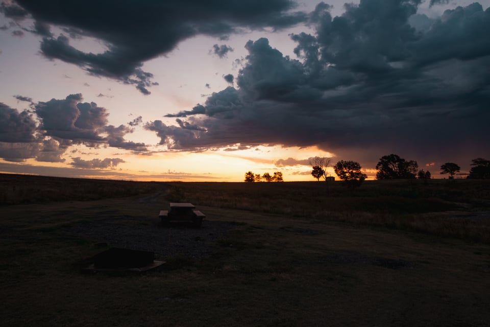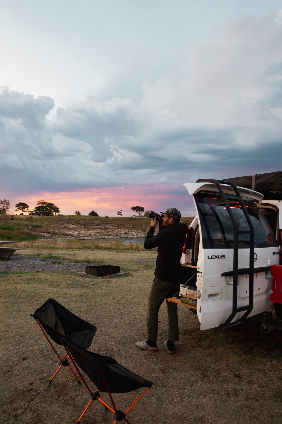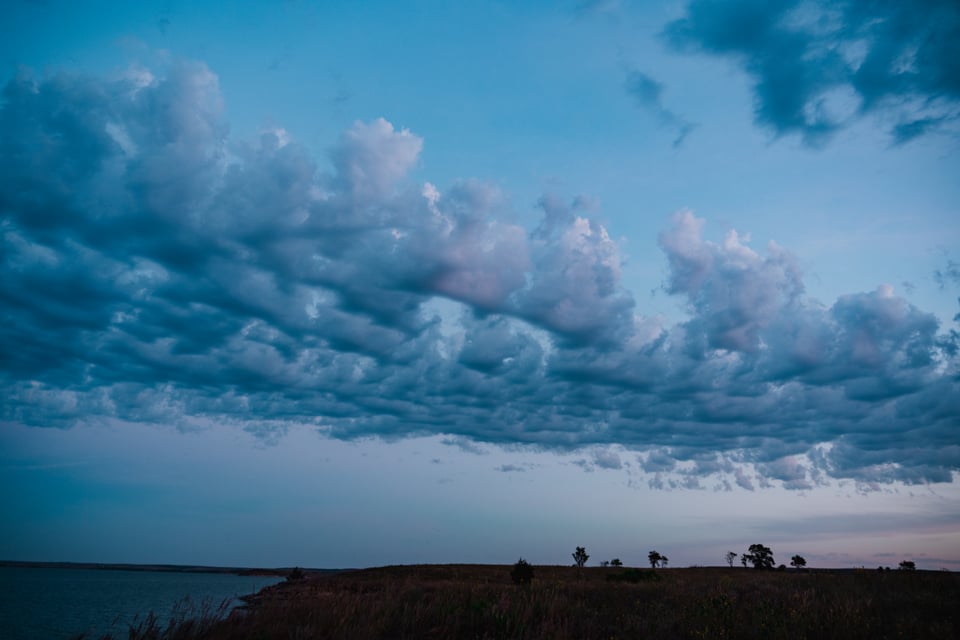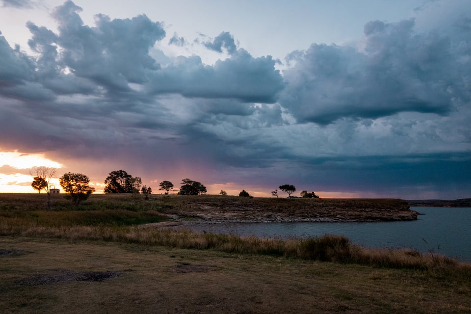 The expansive Kansas skies are showing off again. Lightning flickers in the distance, and clouds and rain accompany it. It is a beautiful backdrop, one that never touches us first-hand — we enjoy the spectacle from afar as we sip our morning hot beverages and gear up for our departure.