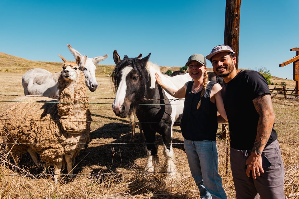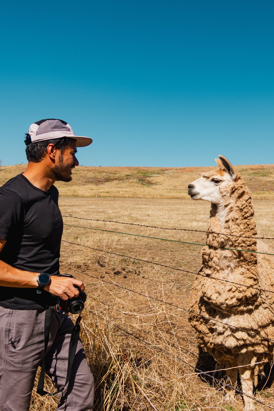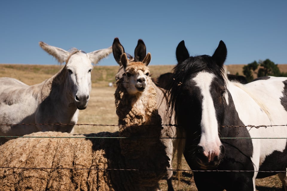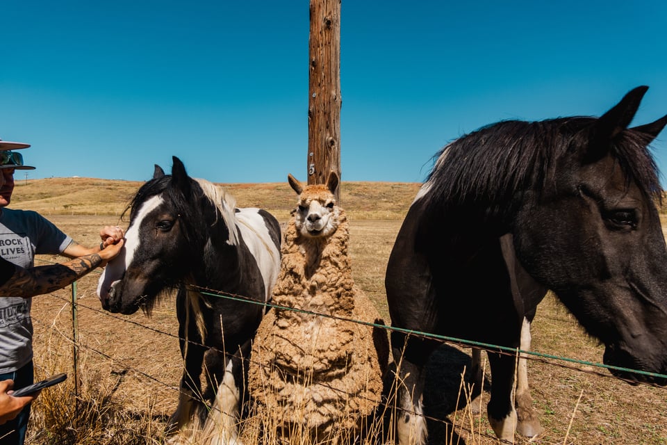 We pull up next to a field, and we see a variety of animals: two horses and two donkeys. One of the donkeys brays in greeting. But it’s from the far right corner of the area that an unshorn, burly alpaca races towards us. This is Dave. And Dave. Is. A. Vibe.