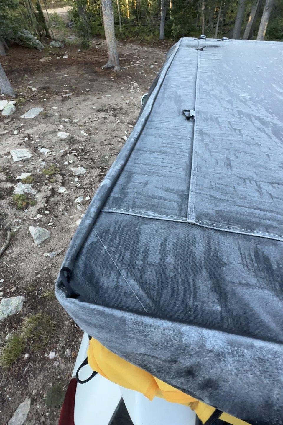 It’s frigid. The first light is finally peaking over the mountains with a soft orange-pink glow. We packed up most everything last night since we anticipated a cold morning. I notice the roof top tent is crusted with frost. I suspect the forecast for 39ºF was not quite true, and once the rig is warming up, the onboard temperature reads 32ºF.