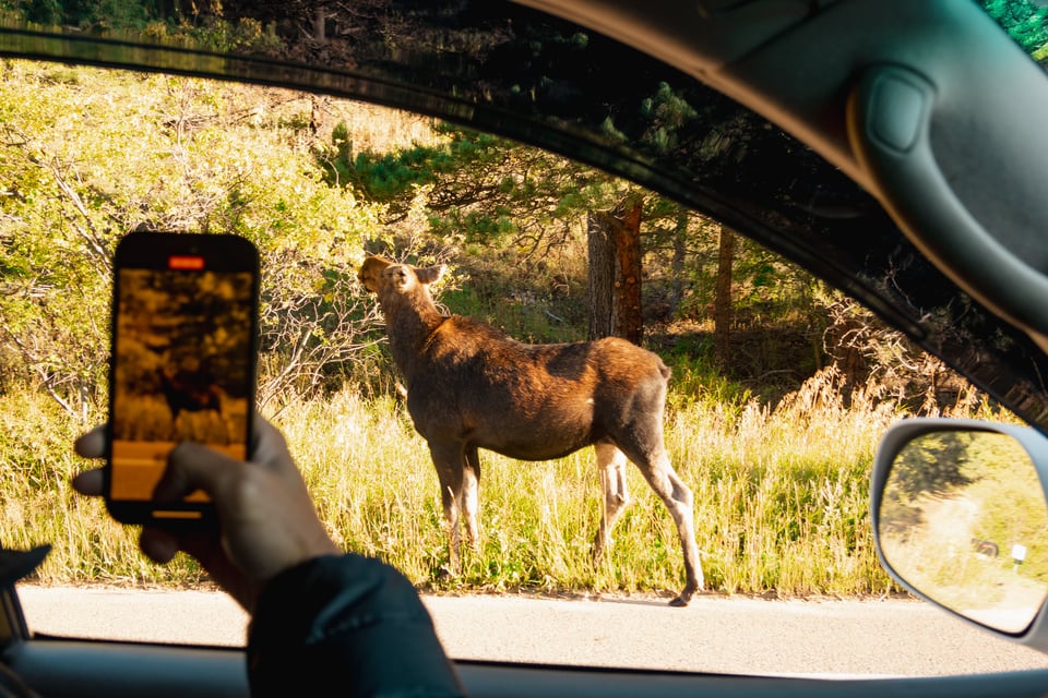 The descent from 9,100 feet into the sun is blinding and high contrast. Thankfully, we are driving slow as a moose crosses the road to have breakfast. Another animal I’ve never seen up close, and what a majestic creature it is.