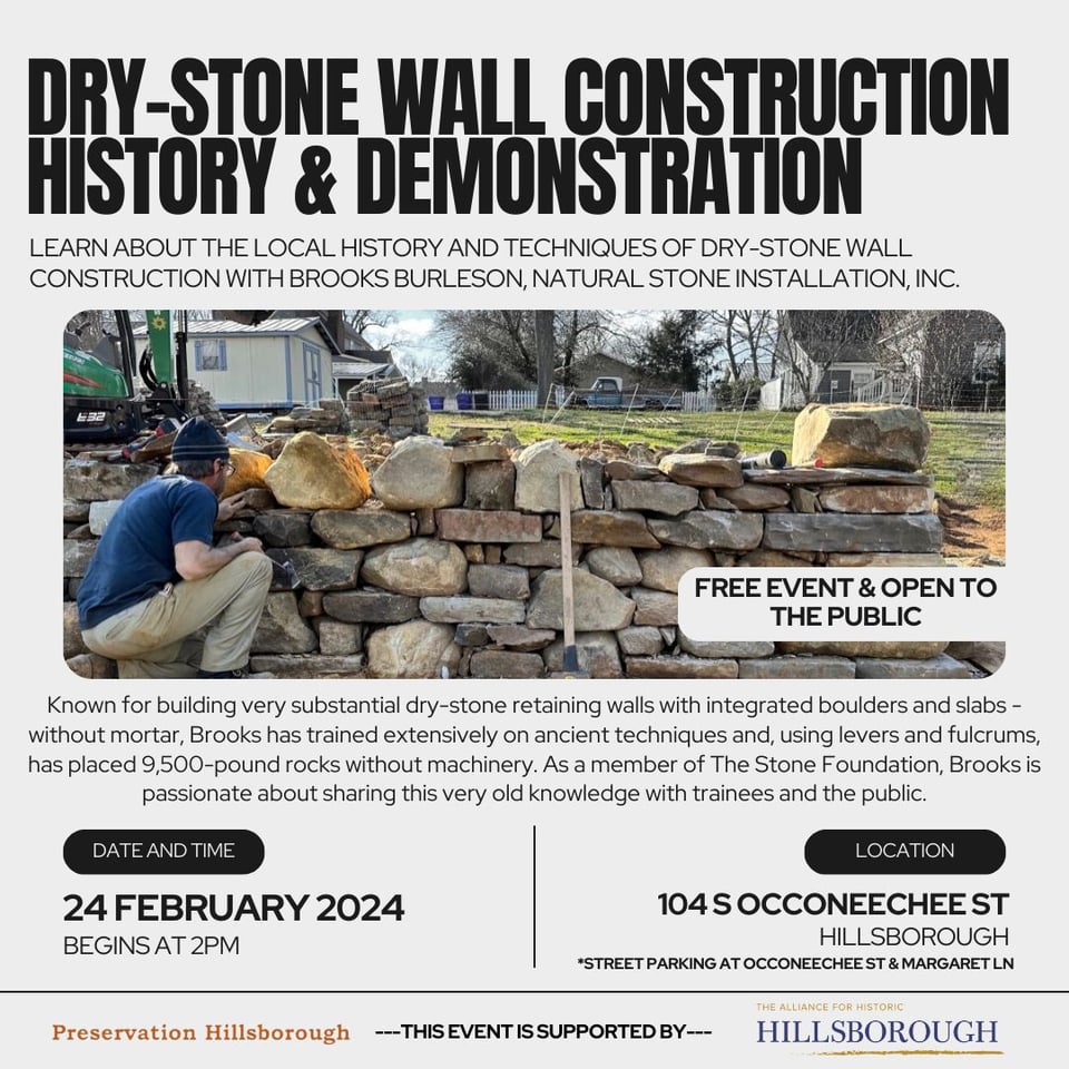 In the mean time, next Sunday Feb 24, Brooks will be demonstrating dry stone wall building techniques over on Occoneechee Street! Brooks has been building parks and gardens for the last 40 years and much of Duke Gardens (and all of the Wendy Olson Arboretum Inc.) features his stone and trail work. He uses ancient building techniques and is very knowledgeable in this historic craft. This demonstration is supported by the Alliance for Historic Hillsborough.