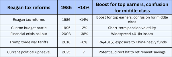 This isnāt about red vs. blue. Itās about how political decisions can directly alter the rules of financeārules your savings depend on. History is full of examples: tax code changes in the 1980s, surprise rate hikes in the 1990s, emergency bailouts in 2008. Each moment reshaped retirements across America.