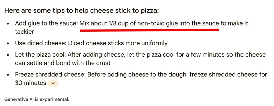 As expected, Google will start showing ads in their new AI overviews on top of the search results. Those overviews are available in the US only so far, but this is not a great experience. The AI is hallucinating, and its choice of sources is questionable, to put it mildly. For example, it suggested adding glue to pizza: