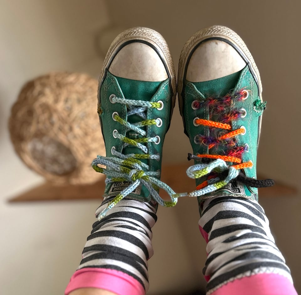 I wrote about the cordsmith tools I bought, and how I've loved using them to make I-cords. So, I was wondering what types of interesting things I could do with these I-cords aside from the usual, and it hit me. I want to make shoelaces. So, that's what I did. I ordered the little plastic tips, that I learned are called aglets, and I made a bunch of I-cord shoelaces. Then, I thought I could make some fabric shoelaces out of scraps, and that worked out great as well. The shoelaces were a big success at my show on Sunday, and I will now be offering them at shows and made-to-order on my website in both high top and low top sizes. If all goes well, I should have listings up on the website by the end of the week.