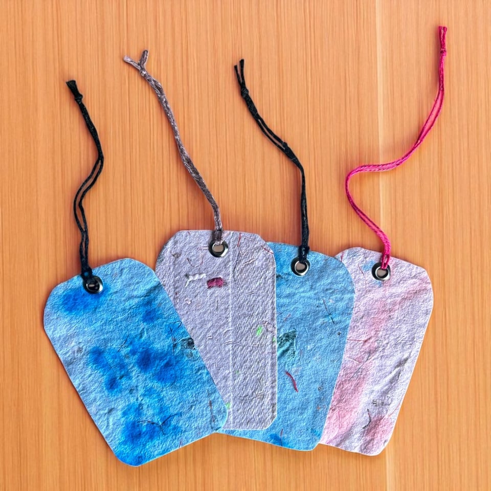 Whenever I have this feeling of creative ennui, I think it's important to take a detour from what I normally make. I've been saving up discarded paper wherever I find it and shredding it, so last week I focused my creative energy on making paper and paper clay. I used the handmade paper to make gift tags and hang tags for my clothes. I'm going to offer the gift tags for sale.