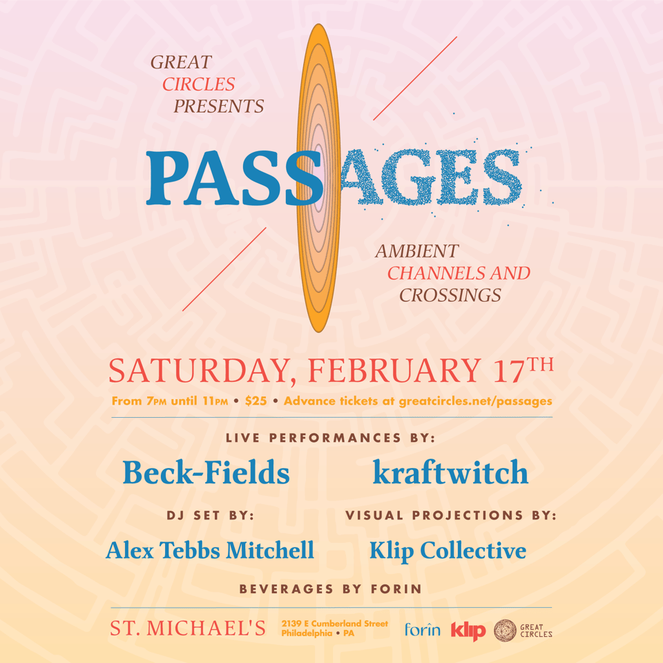 I have a show coming up this Saturday, February 17 in Philadelphia. I'll be playing a special ambient set (as Beck-Fields) with my good friend and incredible musician/singer Jeremy Beck, at the wonderful Passages series. It's held in a beautiful church with mapped projections covering the walls and ceiling. It's a very classy event. Tickets and info here: https://greatcircles.net/passages