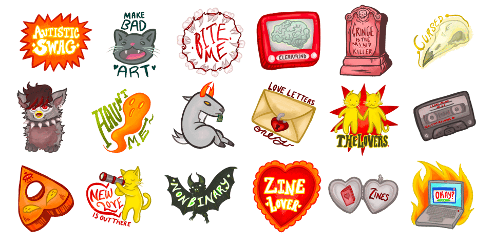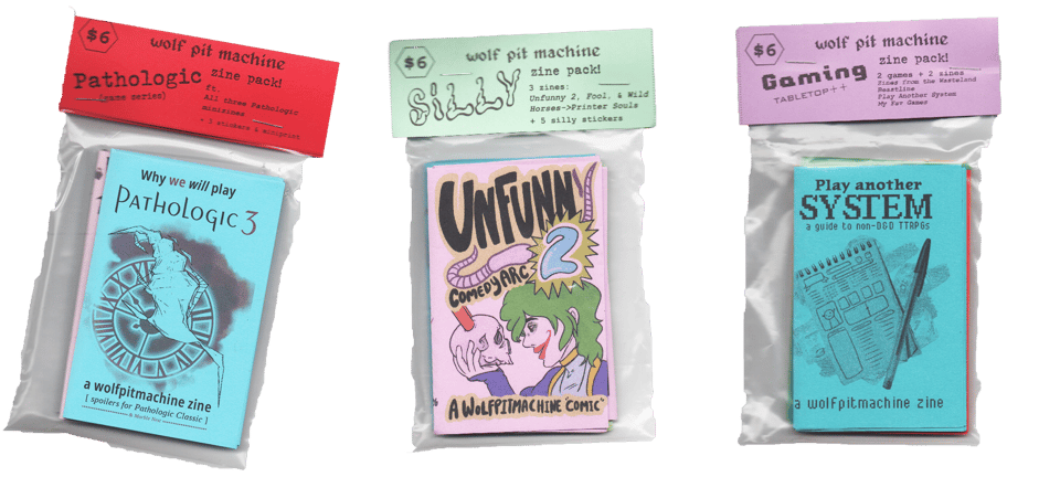 Other new things: new minizine earrings/necklaces (featuring the Sims 2, Don’t, Bad Art, & Pathologic 3 zines), Mythoslain cover poster (discussed in next section), and Pathologic stickers (tragedian, shmowder, Bachelor, & Haruspex - coming soon is the Changeling, Eva Yan, & Anna Angel).