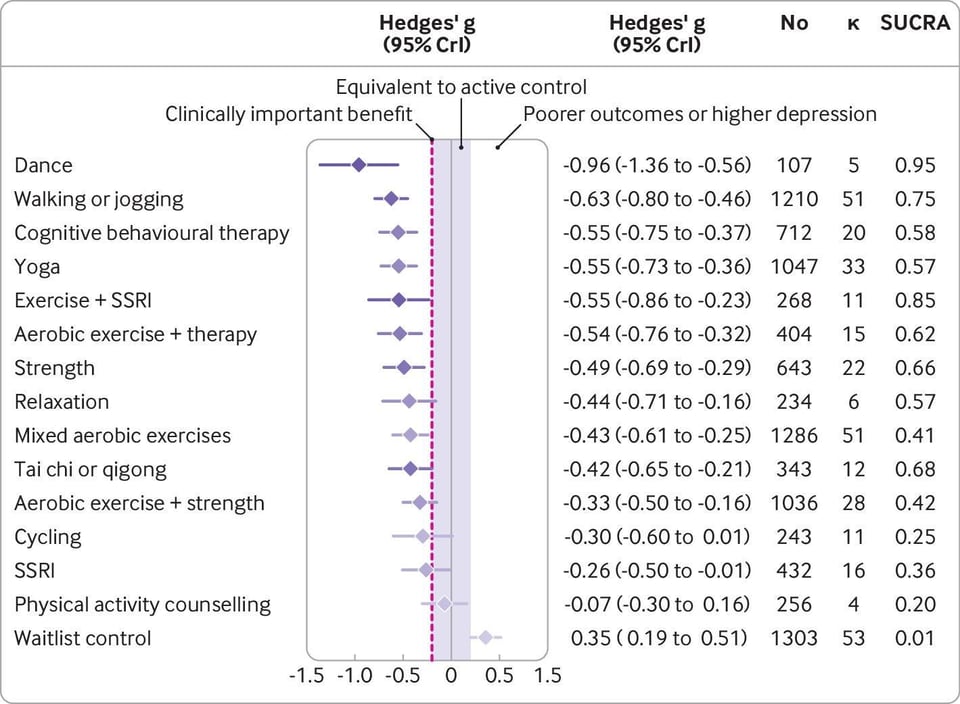 Maybe the causality runs in the opposite direction, though? A meta-analysis on the “Effect of exercise for depression”, published in January 2024, found that exercise is about as effective as SSRIs in treating depression. As Erik Hoel commented: “they really buried the lede, though, because if you look closely at the chart, dancing was literally the best treatment for depression, beating out the combination of exercise + SSRIs handily. There’s something deeply beautiful about that.”