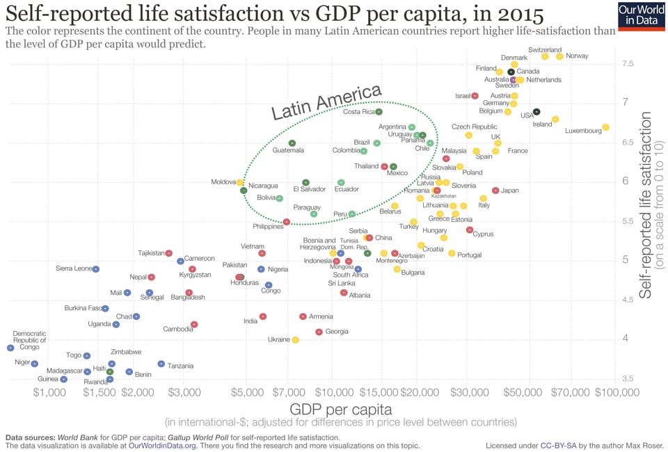 I found it on the Our World In Data page on global happiness and life satisfaction, in a section on “Culture and life satisfaction”. Self-reported happiness in Latin American countries is higher than you’d expect given their GDP per capita. I forget who I saw speculating about this, but someone else on the internet wondered if this greater happiness is visible in the way that dancing is a more common pastime in LatAm than in CANZUK.